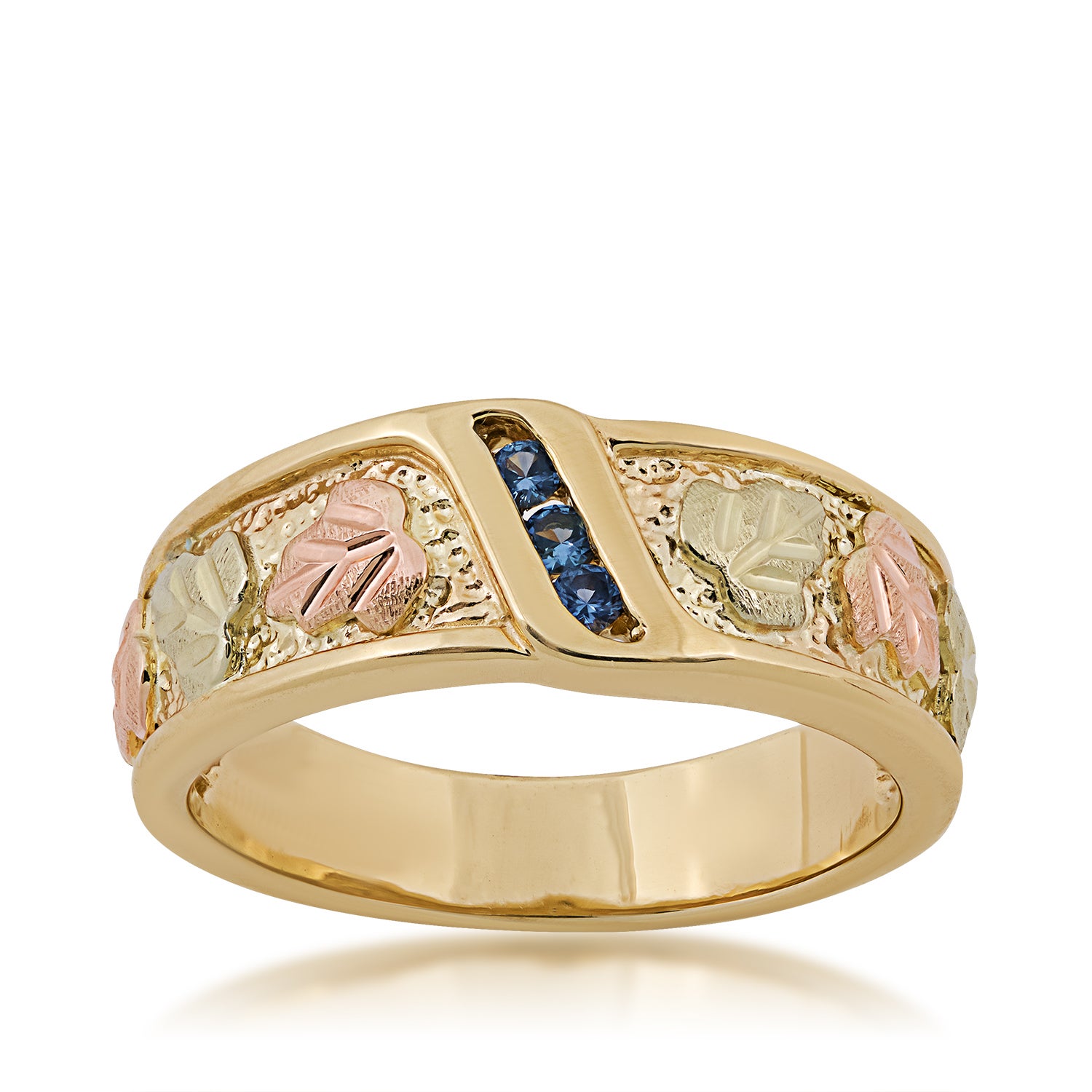 RADIANT 10K YELLOW GOLD LADIES CHANNEL SET BAND FEATURING THREE .02CT (.06CTTW) YOGO SAPPHIRE AND COMPLIMENTED WITH SIX 12K PINK AND GREEN LEAVES Yogo Sapphires – BORN IN MONTANA! Yogo Sapphires – BORN IN MONTANA! Yogo Sapphires come from the world’s largest underground primary deposit of premium high quality, 100%natural sapphires. Unlike most sapphires on the market today, Yogos are not heat treated.