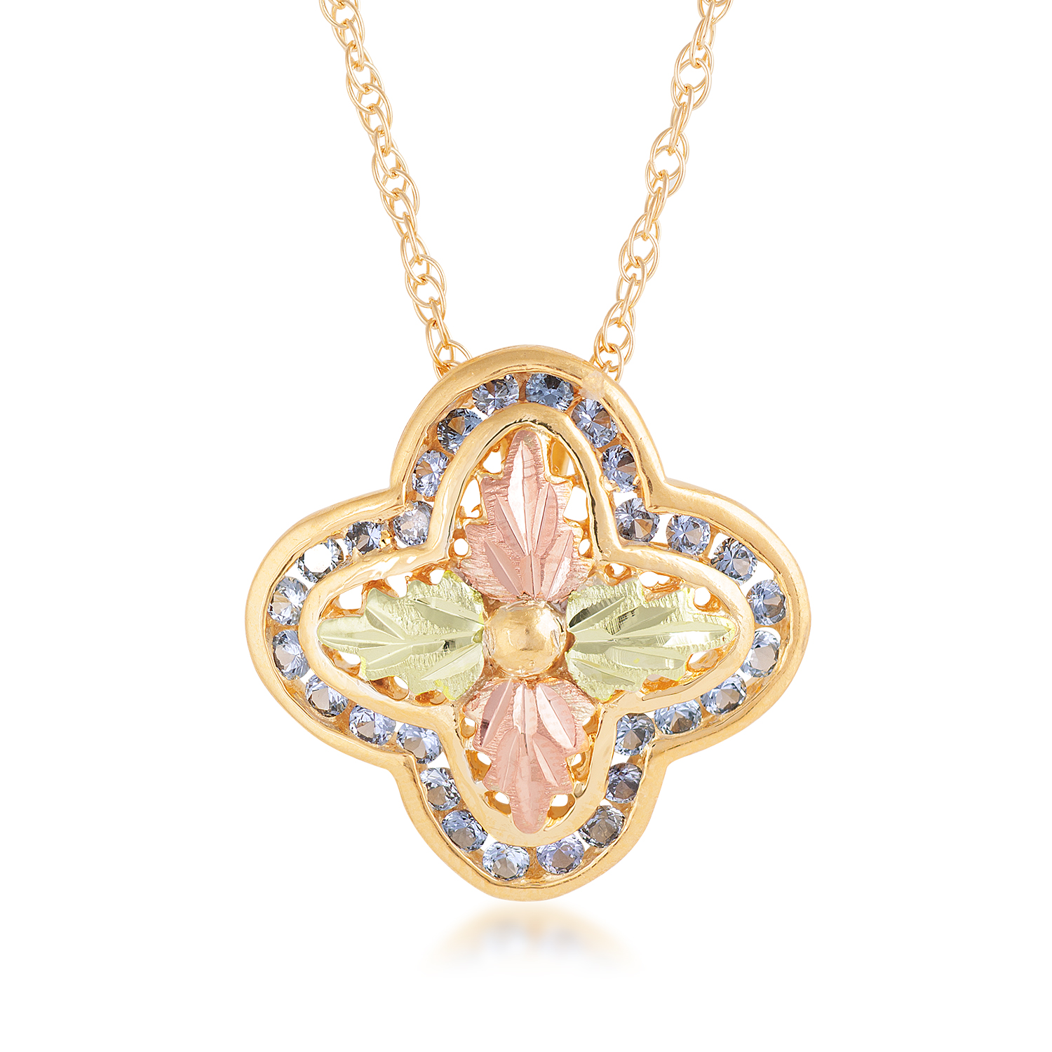 CONTEMPORAY 10K YELLOW GOLD BLACK HILLS GOLD Alahambra pendant SET WITH 1.5MM YOGO SAPPHIRE around the pendant. ACCENTED WITH 12K PINK AND GREEN LEAVES. Yogo Sapphires – BORN IN MONTANA! Yogo Sapphires come from the world’s largest underground primary deposit of premium high quality, 100%natural sapphires. Unlike most sapphires on the market today, Yogos are not heat treated.